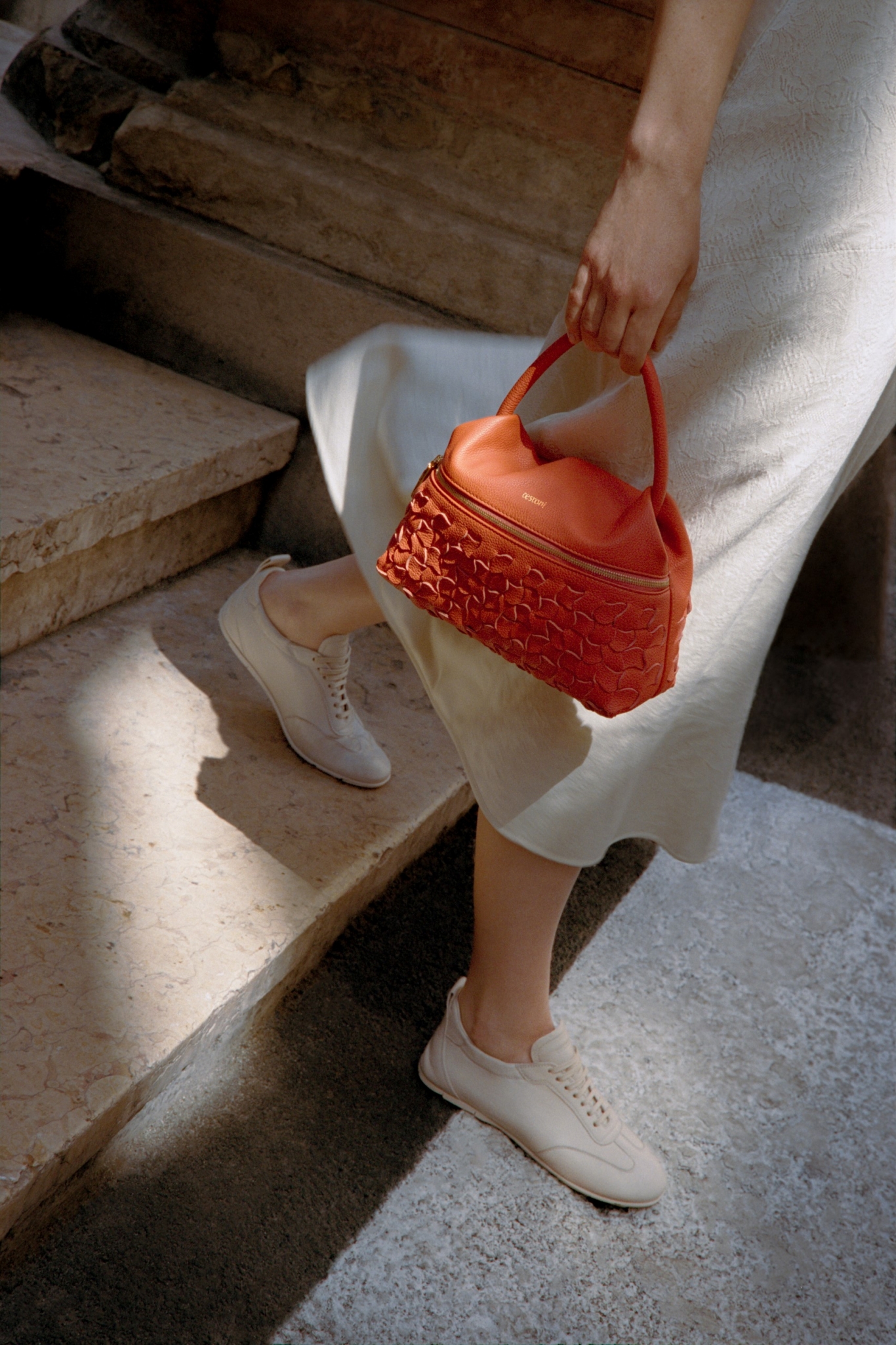 Intreccio曲線編織設計深植於Testoni 的歷史背景中。Marisa Testoni 受到家中庭院樹皮自然曲線的啟發,構思了這個優雅的設計。這些曲線的流動感反映了與自然的聯繫,將有機形狀與精緻工藝融合在一起。這一靈感不僅是對品牌傳承的致敬,也為包款增添了獨特的個性,將藝術性與個人敘事融合,呼應了Testoni 品牌的精神。