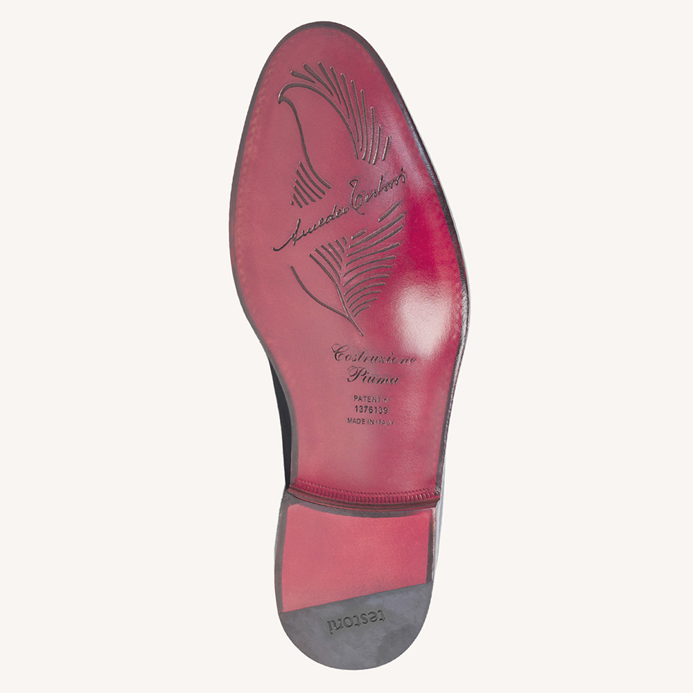 自1929年起,獨家專利的縫合工法Piuma Rapid便成為Testoni的品牌標誌。這項複雜的工藝需經超過200道以上的手工步驟才可以完成,展現品牌對於細節的講究與極致追求。此特殊擁有專利工藝的鞋款,採用酒紅色皮革鞋底上面壓印著羽毛標誌及Piuma Rapid專利編號,承諾著品牌為顧客打造一雙具有柔韌性、防水功能與舒適性的完美鞋履,並賦予雙腳最極致與舒適的穿著體驗。