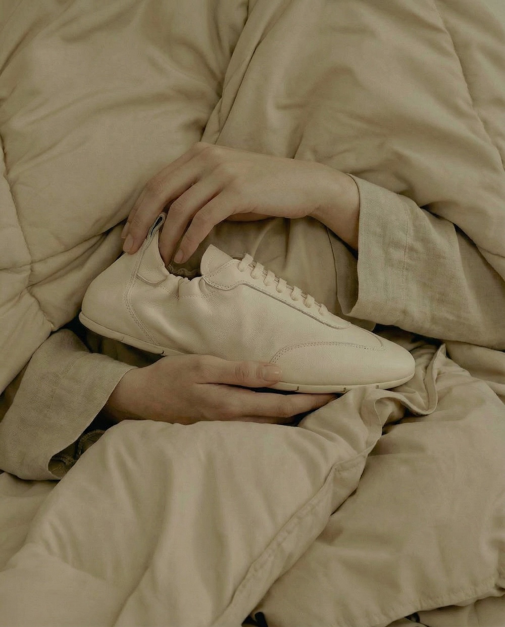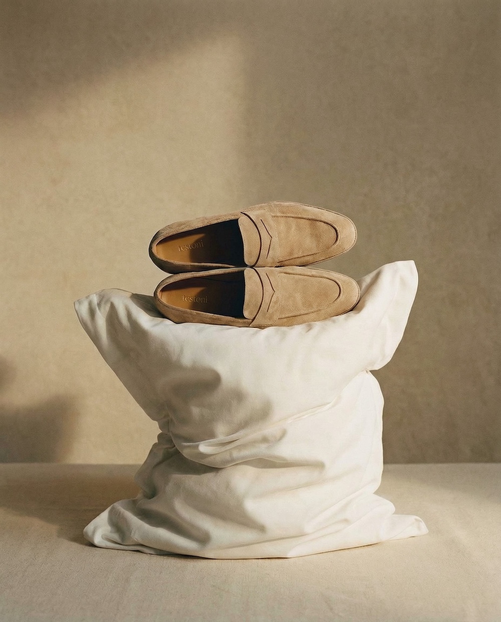 本季形象視覺以柔軟的織品與枕墊為背景,象徵如同日常生活般的舒適與包覆感,強調品牌將「舒適」視為奢華的重要元素。透過細膩材質與簡潔設計,Testoni 2026 春夏系列傳遞出一種輕鬆而優雅的生活態度。