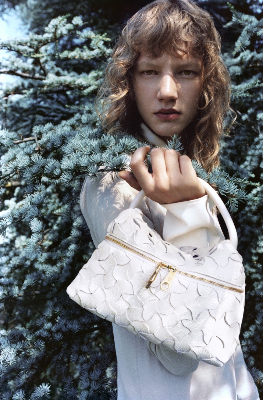 Testoni 手提包如雪地般的色澤凸顯了曲線編織的陰影變化。